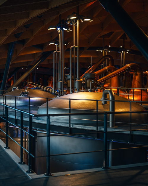 La arquitectura de la destilería en Speyside refuerza esta narrativa. Integrada de manera orgánica en el paisaje escocés, la estructura no busca imponerse visualmente, sino dialogar con el entorno. El diseño fluido responde a una visión donde naturaleza, proceso y creación se integran bajo un mismo gesto creativo.